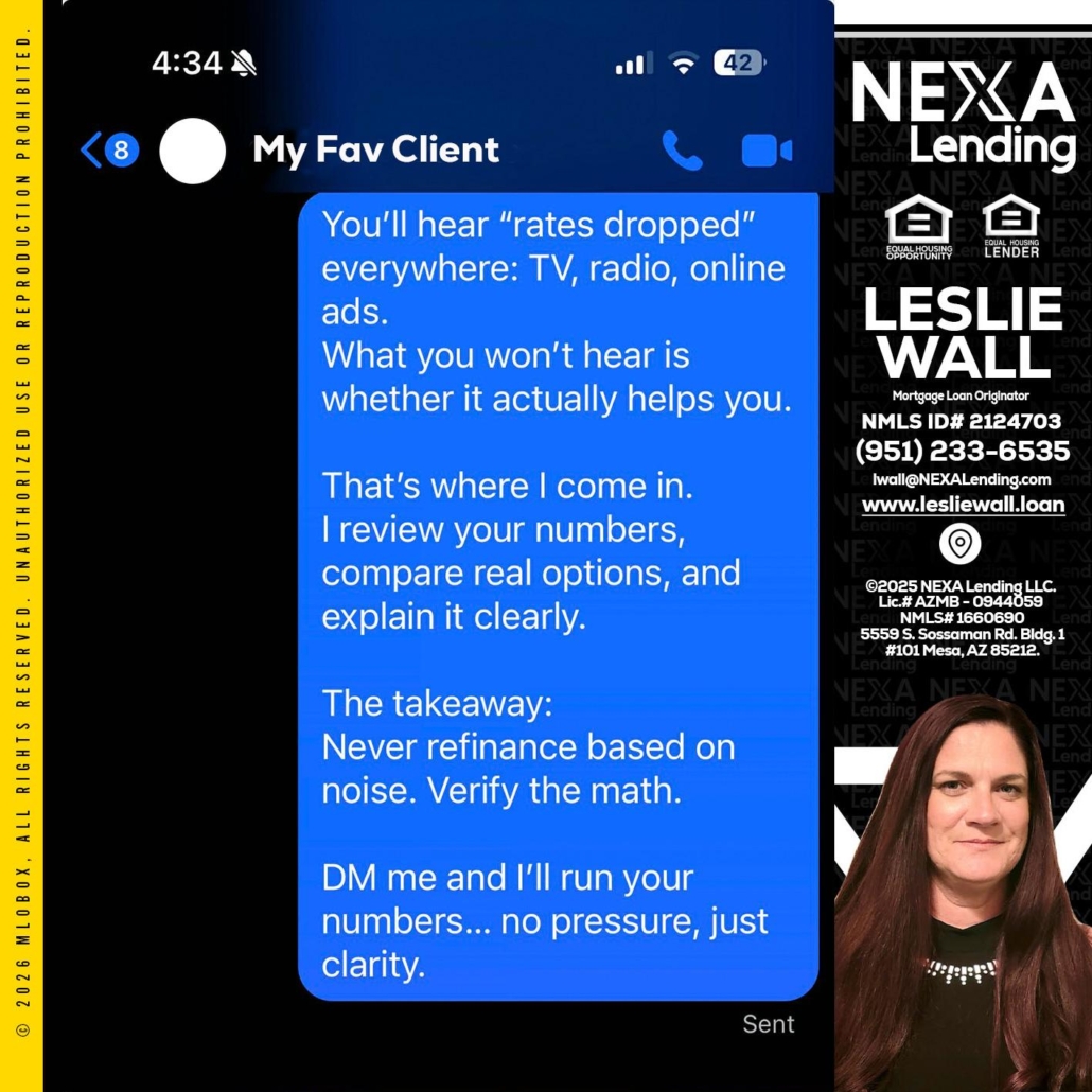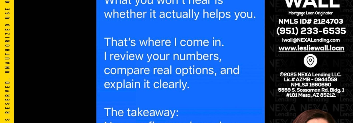 MY FAV CLIENT - Leslie Wall -Mortgage Loan OriginatorHi, my name is Leslie Wall. I’m a Loan Officer with NEXA Lending LLC., offering personalized mortgage solutions, fast customized quotes, great rates and service with integrity.