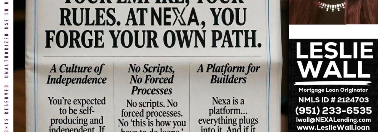 THE NEXA BUILDER - Leslie Wall -Mortgage Loan OriginatorHi, my name is Leslie Wall. I’m a Loan Officer with NEXA Lending LLC., offering personalized mortgage solutions, fast customized quotes, great rates and service with integrity.