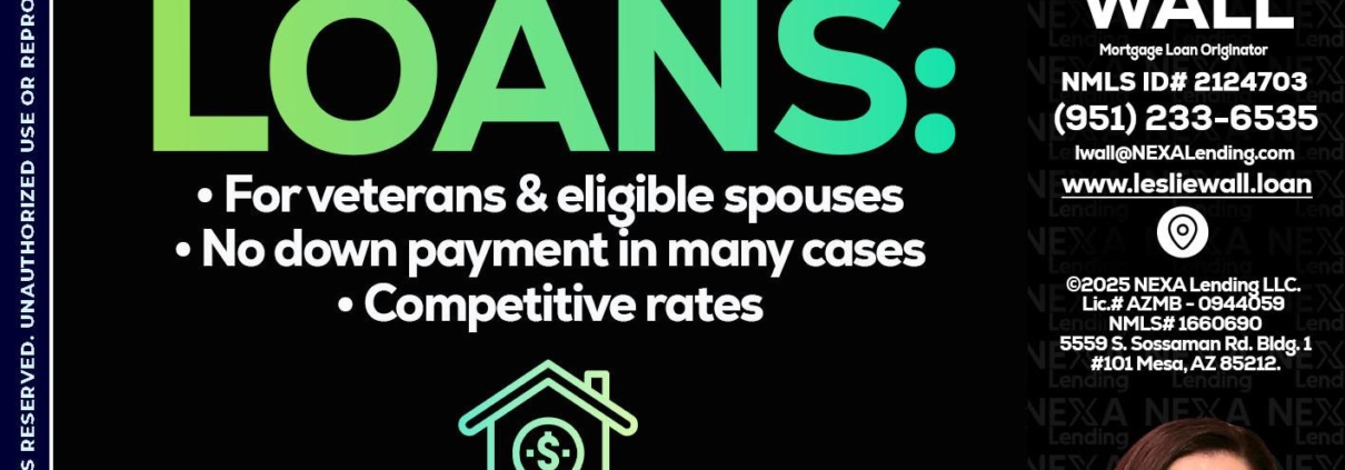VA LOANS - Leslie Wall -Mortgage Loan OriginatorHi, my name is Leslie Wall. I’m a Loan Officer with NEXA Lending LLC., offering personalized mortgage solutions, fast customized quotes, great rates and service with integrity.